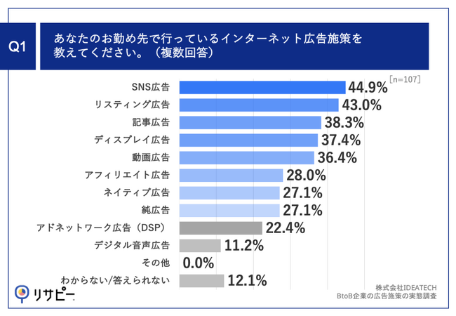 ワンストップでリサーチデータマーケティングを実現する「リサピー(R)?」(https://ideatech.jp/service/research-pr)を運営する株式会社IDEATECH(本社:東京都港区、代表取締役社長:石川友夫)は、BtoB事業の広告担当者107名対象に、BtoB企業の広告施策の実態調査を実施しましたので、お知らせいたします。