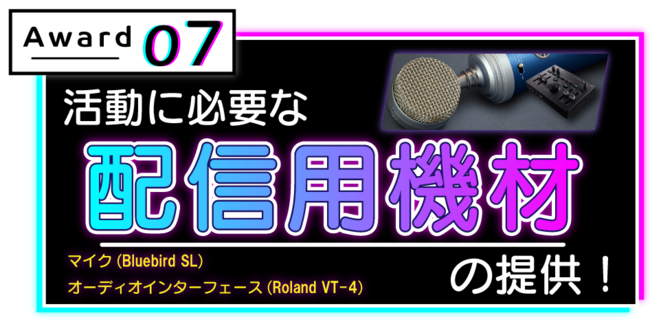 今回のオーディションの合格者には、有名イラストレーターLOWRISEによる合格者の希望に沿ったのキャラクターデザインと機材を提供。また、動画再生回数2,000万回を超える「気まぐれメルシィ」や「Gimme×Gimme」を作曲した八王子Pによるオリジナル楽曲制作、超人気バーチャルYouTuber「ミライアカリ」とのコンピレーションアルバムコラボリリースなどVSingerとして華々しくデビューしていただけます。