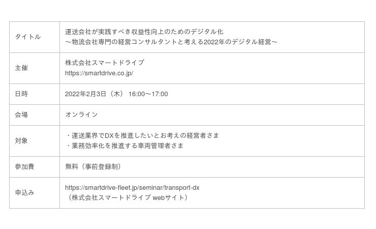 2022年2月3日(木)16:00〜17:00、株式会社スマートドライブが主催するセミナー「運送会社が実践すべき収益性向上のためのデジタル化 〜物流会社専門の経営コンサルタントと考える2022年のデジタル経営〜」にて、船井総研ロジ株式会社(東京本社:東京都千代田区、代表:菅重宏、以下「船井総研ロジ」)DXコンサルタントが運送業における収益性向上とデジタル化をテーマに講演します。