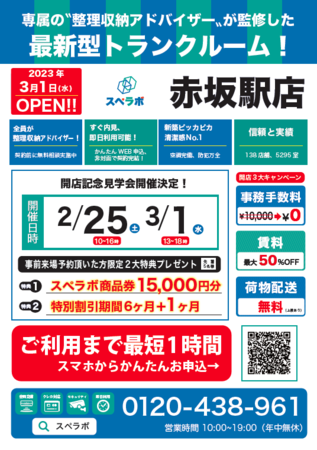 【赤坂駅店/3月1日(水)オープン】見学から契約、解約まで完全非接触・非対面、お申し込みからご利用まで最短1時間!都内、大阪などにて絶賛運営中のトランクルーム【スペラボ】が赤坂駅近くに出店!