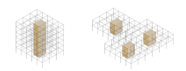 1〜3階建ての低層建築向けのオリジナルLC-core構法の『コア』の考え方を活かし、6階建てCLT建築を実現しました。本プロトモデルは、片持ちコア構造を採用し、ひとつのコアにおける負担可能な床面積によって、基本的な設計をシステマティックにできます。