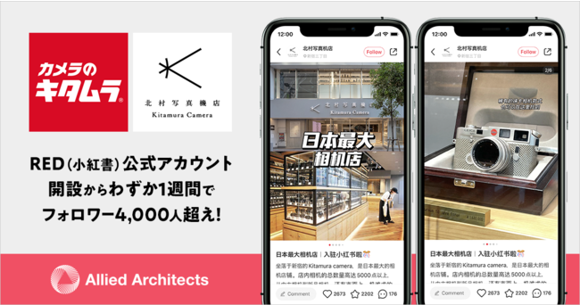 企業のマーケティングDXを支援するアライドアーキテクツ株式会社(東京都渋谷区、代表取締役社長 CEO:中村壮秀、証券コード:6081)で中国進出支援事業を展開するクロスボーダーカンパニー(プレジデント:番匠達也)は、株式会社キタムラ(東京都新宿区、代表取締役社長:浜田宏幸、以下「キタムラ」)が運営する「カメラのキタムラ」に対して、新宿 北村写真機店のRED(小紅書、以下RED)公式アカウントの開設から投稿内容の企画、制作、投稿作業、定期的なレポート報告まで含む公式アカウント運営代行サービスを提供し、アカウント開設からわずか1週間でフォロワー4,000人を突破しましたのでお知らせいたします。