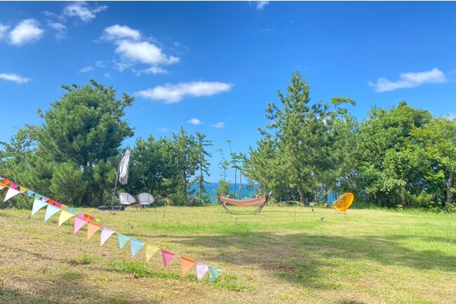 休暇村園地内にある日本海を望む芝生広場ではアクティビティやチェアリングなどをして過ごしながら、SNS用の撮影も楽しんでいただけるよう、アクティビティ用ギアのレンタルやパラソル、チェアなどをご用意し、曜日限定で夜には焚火も実施します。芝生広場の利用は無料で、県内外を問わず宿泊客以外でも利用することができます。また、周辺にはインスタグラムでの投稿や新聞、エリア情報紙などのメディアにも取り上げられる二の浜海岸などのフォトスポットも多数あります。