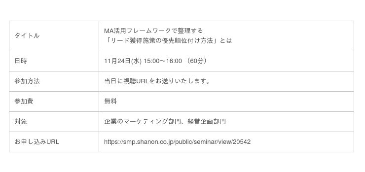 株式会社シャノン(本社:東京都港区、代表取締役社長:中村 健一郎)は、「リード獲得からMAの活用をはじめたい」とお考えのかたへ、リード獲得施策の進めかたをご紹介するウェビナーを11月24日(水)に開催いたします。
