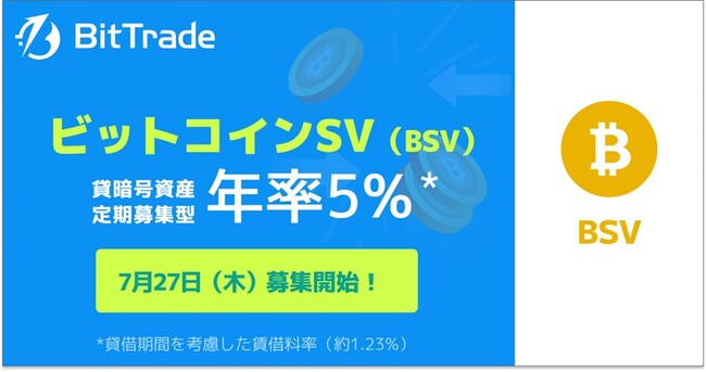 ビットトレード株式会社(所在地:東京都港区、代表取締役社長:関 磊、以下「ビットトレード」)は、2023年7月27日(木)より、 ビットコインSV(BSV)の貸暗号資産定期募集を実施いたします。