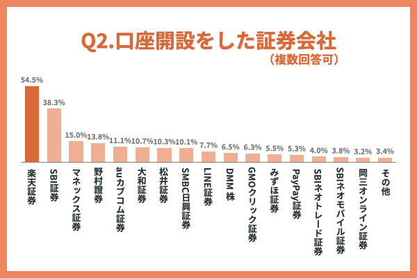 投資目的で口座開設をした証券会社1位は「楽天証券(54.5%)」で、2位が「SBI証券(38.3%)」という結果になりました。