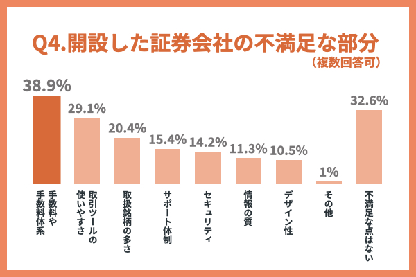 不満足な部分では「手数料や手数料体系(38.9%)」が最も多く、次に「取引ツールの使いやすさ(29.1%)」が多いという結果でした。(不満足な点はないを除く)