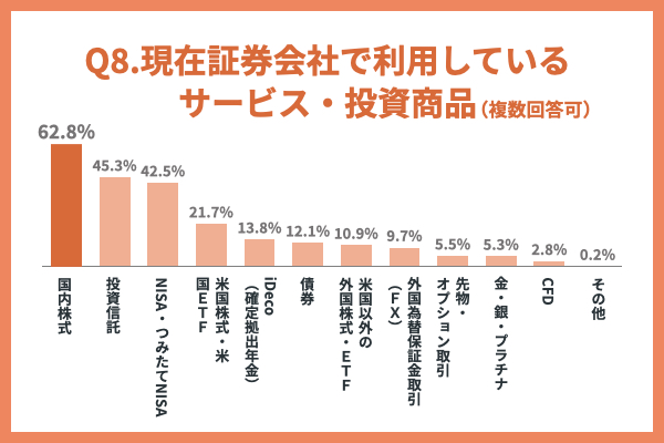 証券会社で利用しているサービス・投資商品では「国内株式(62.8%)」が最も多く、次は「投資信託(45.3%)」が多いという結果でした。