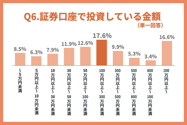 証券口座の投資金額では「100万円以上〜300万円未満(17.6%)」が最も多く、次に「1000万円以上〜(16.6%)」が多いという回答結果になりました。