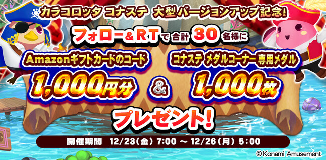 さらに、バージョンアップを記念して、「新規登録者応援キャンペーン」「フォロー&RTキャンペーン」を開催します。初めて「コナステ メダルコーナー」をプレーいただく方に「コナステ メダルコーナー」で使用できるメダルをプレゼントするほか、Twitterのキャンペーンにご参加いただくと抽選でメダルやAmazonギフトカードのコード1,000円分をプレゼントします。