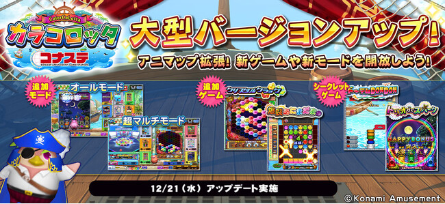 株式会社コナミアミューズメントは、自宅のPCやスマートフォンでメダルゲームが楽しめる「コナステ メダルコーナー」にて、『カラコロッタ コナステ』が本日12月21日に大型バージョンアップしたことをお知らせします。