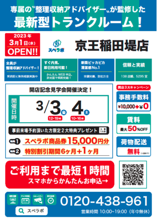 【京王稲田堤店/3月1日(水)オープン】見学から契約、解約まで完全非接触・非対面、お申し込みからご利用まで最短1時間!都内、大阪などにて絶賛運営中のトランクルーム【スペラボ】が京王稲田堤駅近くに出店!