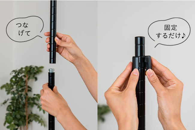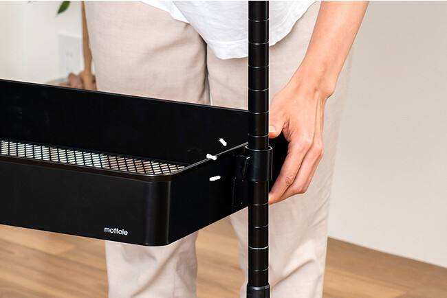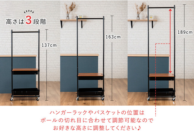 固定具の位置は自由に変更できるため、棚も上部のハンバーパイプもお好みの高さに調節が可能です。