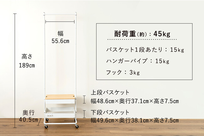 耐荷重(約)・・・・・・・・45kg(1段あたり15kg、ハンガーパイプ15kg、フック3kg)