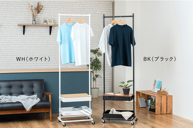 収納バスケットとハンガーラックがついて、省スペースでもたっぷり収納を実現。