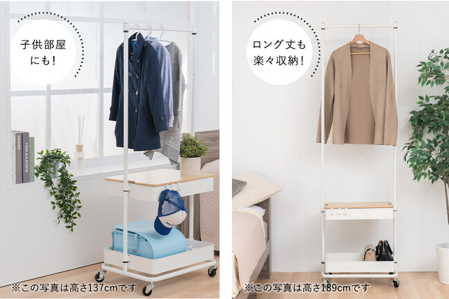 子供服から大人のロングコートまで様々なアイテムの収納が可能です。