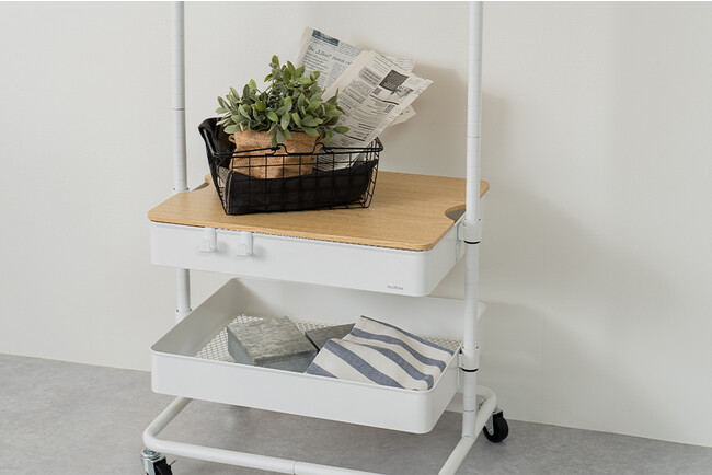 接続パイプ:スチール、天板:MDF、キャスター:PP・スチール、フック、