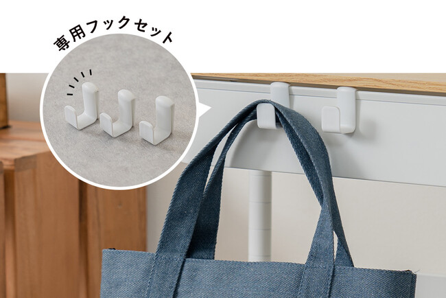 帽子や洋服ブラシ、子供の巾着袋やポーチなど、こまごましたものを掛けるのに便利な「専用フック」をセットでお届けします。