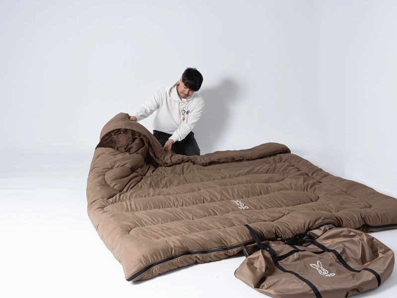 また、家族4人分の寝袋がこれ1つで済むため、4つ分を購入する費用や準備・片付けの労力や時間を大幅節約。収納袋を寝袋に縫い付けた独自構造により袋をなくす心配なく、慣れれば1分ほどで撤収可能です。