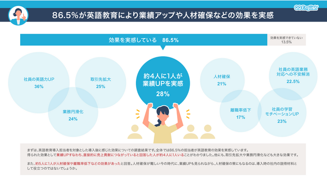 英語研修を導入している企業の86.5%が「効果を実感している」と回答