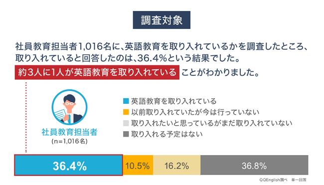 「Q1.企業の研修担当者(人事・経営者)1,016名に、英語教育を取り入れているか」を調査したところ、取り入れていると回答したのは36.4%という結果でした。