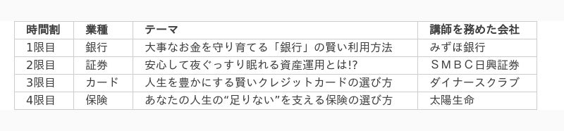 「未来のマネーフェス〜楽しく学べる金融経済教育」は読売新聞社主催で行われた金融経済教育イベントで、お金を扱う代表的な業種である「銀行」「証券」「カード」「保険」から各1社ずつの企業が講師役として登場。生徒役で出演したタレントの高山一実さん、お笑い芸人のさや香、ビスケットブラザーズと、一般から募った参加者に向けて、各分野に関する金融授業を実施しました。