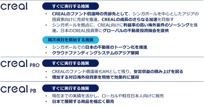 このたびの取引はCREAL ASIA設立以降、新たな海外投資家とのリレーションの構築を図ることにより受託に至った第1号案件であり、当社グループのグローバル展開の着実な進展を示すものとなっております。海外投資家の対日不動産投資ニーズは底堅く推移している中で、当社グループはグローバルでのビジネスチャンスを捉えながら、引き続き「不動産投資を変え、社会を変える。」というミッションの達成に向け、国内外の展開を図って参ります。