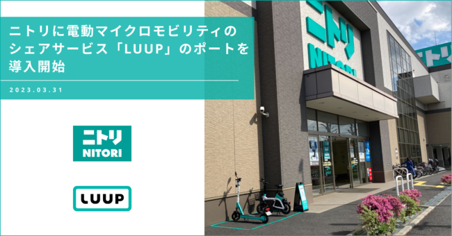 株式会社Luup(本社:東京都千代田区、代表取締役社長兼CEO:岡井大輝、以下「Luup」)は、株式会社ニトリ(本社:札幌市北区、代表取締役社長:武田政則、以下「ニトリ」)と連携し、初の家具・インテリア専門店のポートとして、都内のニトリ2店舗に、2023年4月1日(土)より電動マイクロモビリティのシェアサービス「LUUP」のポートを導入したことをお知らせします。