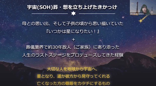 創業のきっかけは「ひとは亡くなったら星になるのよ」という子供の頃に聞いたお母さんからの一言だったそうです。