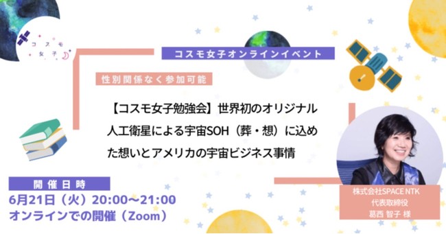 株式会社Kanatta(東京都目黒区、代表取締役社長:井口恵)が運営する【コスモ女子】は、6月21日(火)に株式会社SPACE NTK 代表取締役 葛西智子様にご登壇いただき、世界初のオリジナル人工衛星による宇宙SOH(葬・想)に込めた想いと、海外の宇宙事情についてお話しいただきました。
