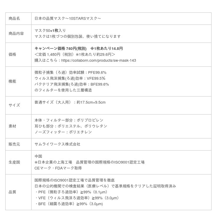 サムライワークス株式会社(代表取締役社長:新島 実 本社所在地:東京都渋谷区)は、新型コロナウイルスの感染再拡大を受け、飛沫・感染防止の対策として品質を保証する国際規格(ISO9001)など、日本企業の上海工場で、品質管理を徹底して製造された高品質マスク『日本の品質マスク〜10STARSマスク〜』を好評につき、耐久性がさらに向上した細い耳紐3.5mmバージョンを販売開始致します。販売実績500万枚突破の『日本の品質マスク〜10STARSマスク〜』は、日本の検査機関でフィルター性能を検査し、PFE99.6%、VFE99.5%、BFE99.6%の捕集効果があることが証明されました。