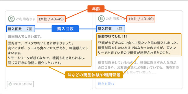 ZENB JAPANでは、新規顧客獲得向けのLPにLetroを活用し、レビューの掲載を開始しました。運用の手始めに、ページ訪問者の想定状態を踏まえて、UGCで解消すべき不安点やUGCで補強すべき情報を定義。それらを表現する項目を設計しレビューを収集しました。項目には、「年齢情報」や「購入回数情報」とともにそれぞれの訴求を引き出すための設問項目を盛り込むことで、訴求を強化することができただけでなく、年齢情報による自分事化の促進と、購入回数によるクチコミの信頼度を向上させることに成功しました。