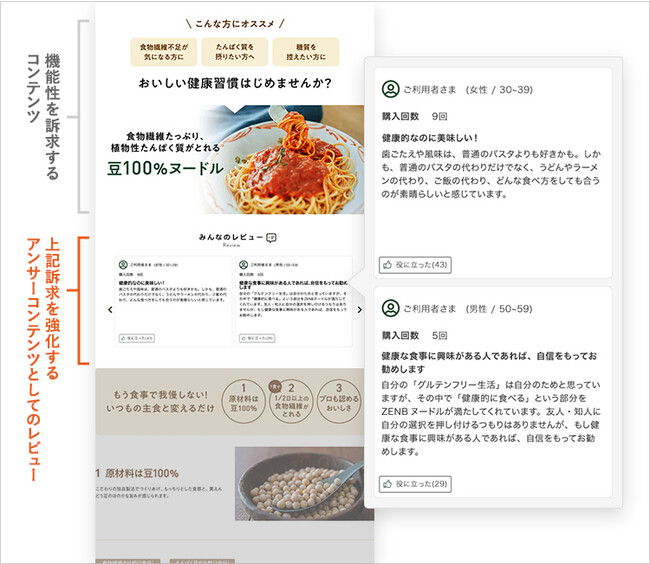 企業のマーケティングDXを支援するアライドアーキテクツ株式会社(東京都渋谷区、代表取締役社長 CEO:中村壮秀、証券コード:6081)でSaaS事業を展開するプロダクトカンパニー(カンパニープレジデント:村岡弥真人)は、株式会社ZENB JAPAN(愛知県半田市、代表取締役社長:濱名誠久、以下 ZENB JAPAN)に対し、当社の運用型UGC(※1)ソリューション「Letro(レトロ)」を活用して、新規顧客向けLPにおける獲得成果向上のためにレビュー(※2)を活用する支援を行いました。主力商品「ゼンブヌードル」のLPにおいてレビュー運用を行うことでCVR1.32倍を実現しました。