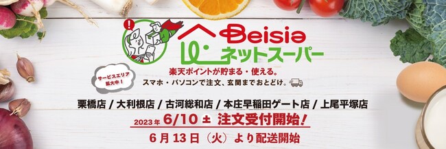 株式会社ベイシア(本社:群馬県前橋市、代表取締役社長:相木孝仁)は、楽天グループ株式会社(以下「楽天」)が提供するネットスーパーのプラットフォーム「楽天全国スーパー」内に出店する「ベイシアネットスーパー」において、2023年6月13日(火)より栗橋店・大利根店・古河総和店・本庄早稲田ゲート店・上尾平塚店からの配送を開始いたします。