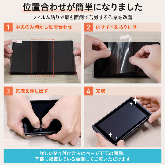 表面硬度3Hで、スイッチの液晶画面を擦り傷から守る極薄PET素材。貼りやすい三分割タイプの保護フィルムなので、今まで貼り付けサービスなどを利用していた方にもおすすめ。貼り方マニュアル動画付き