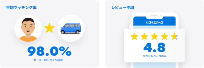さらには、「ハコベルカーゴ」におけるマッチング率は98.0%、レビュー平均も4.8点とお客様の満足度はますます高く、日々高品質なサービスを提供しております。
