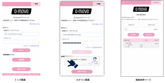 更に、QUADRACが提供する交通決済クラウドサービス「Q-move」と接続して決済処理を行うため、安心・安全でスピーディーな運賃決済が可能で、お客様の乗降履歴は降車後、すぐにQ-moveサイトで確認することが出来ます。