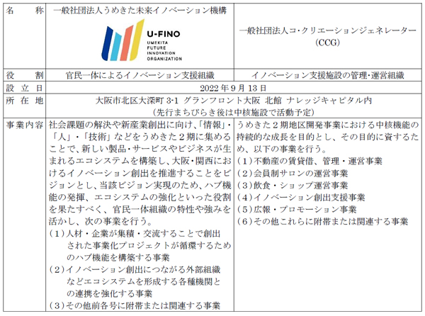今般、まちの中核機能である新産業創出の実現に向けて、事業者JVにおいて、イノベーション支援の役割を担う「中核機能」の運営法人として「一般社団法人うめきた未来イノベーション機構(以下、「U-FINO」)」及び「一般社団法人コ・クリエーションジェネレーター(以下、「CCG」)」を設立することになりましたので、お知らせします。