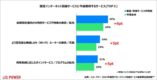 通信面では、「より高性能な無線LAN(Wi-Fi)ルーターの提供/交換」が市場全体より求める声が強かった。動画や映像サービス利用者は、長期利用特典といった提供サービスや、ポイントサービスといった料金面に加えて、安定的な通信品質の提供を事業者に求める傾向が強いことがうかがえた。