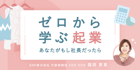 SHE likes起業コースは、起業に必要な基礎知識や流れを理解し、自分が思い描く事業の立ち上げを学べるコースです。 SHE創業者の福田が講師を務め、実際の立ち上げ経験からリアルな起業を学べます。