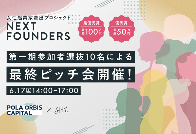 女性向けキャリアスクール「SHElikes(シーライクス)」の運営をはじめ、女性の社会進出と自己実現の支援に取り組むSHE株式会社(所在地:東京都港区、代表取締役CEO:福田恵里、以下SHE) は、株式会社ポーラ・オルビスホールディングス(本社:東京都中央区 社長:横手喜一、以下「ポーラ・オルビスホールディングス」)と協業で開始した女性起業家輩出プロジェクト「NEXT FOUNDERS」の最終ピッチ会を、6月17日(土)に開催します。