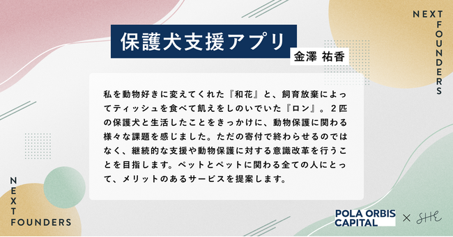 「NEXT FOUNDERS」は、SHEと株式会社ポーラ・オルビスホールディングスが協働でスタートした女性起業家輩出プロジェクトです。SHElikesの起業コースで学びながら事業立ち上げを目指すことで、女性にとって起業という挑戦がより身近な人生の選択肢となるようにとの想いから立ち上げました。