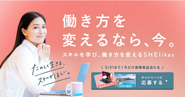 SHElikesでは、時間や場所にとらわれずに働ける38以上の職種スキルが定額で学び放題です。Webデザイン・Webマーケティング・ライティングなどPC一つで働けるクリエイティブスキルを幅広く学ぶことで新しい“好き“に出会い、私らしい働き方の実現に伴走するキャリアスクールです。