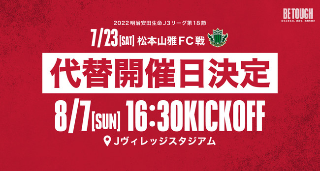このたび、新型コロナウイルス感染症の影響により中止となりました、2022明治安田生命J3リーグ 第18節 いわきFC vs 松本山雅FCは、8月7日(日)16:30キックオフ、Jヴィレッジスタジアムにて代替開催することが決定しましたので、お知らせいたします。