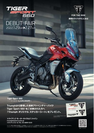 トライアンフモーターサイクルズジャパン株式会社(代表取締役:大貫陽介、東京都港区)は、日々の通勤から週末のツーリングまで、どんなシーンでもライダーの期待を上回る性能を発揮する、新型Tiger Sport 660のデビューフェアを2022年1月29日(土)〜 2月27日(日)までの期間中、全国のトライアンフ正規販売店にて開催することをお伝えいたします。