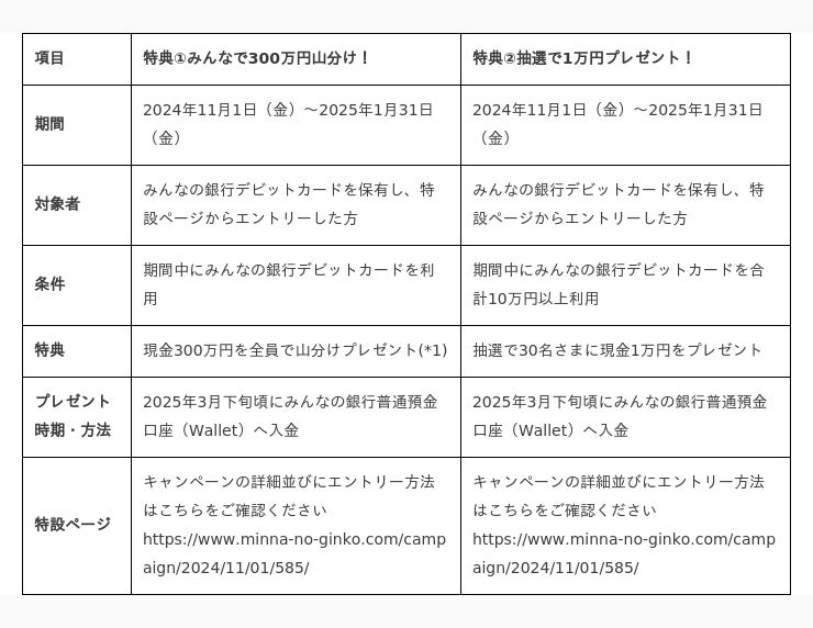 株式会社みんなの銀行(取締役頭取 永吉 健一、以下「みんなの銀行」)では、2024年11月1日から2025年1月31日の間、「デビット山分けキャンペーン」を実施します。