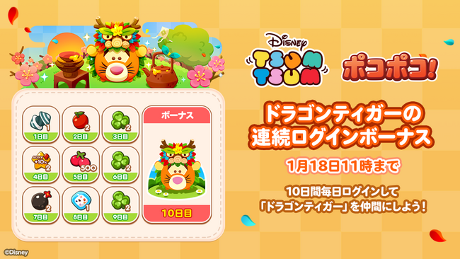 期間中、「LINE ポコポコ」にログインするだけで、クローバーやチェリーなどゲーム内アイテムをログイン報酬としてプレゼントします。さらに10日間ログインすると、限定仲間の「ドラゴンティガー」を仲間にできます。報酬は1日1回ずつ入手可能です。