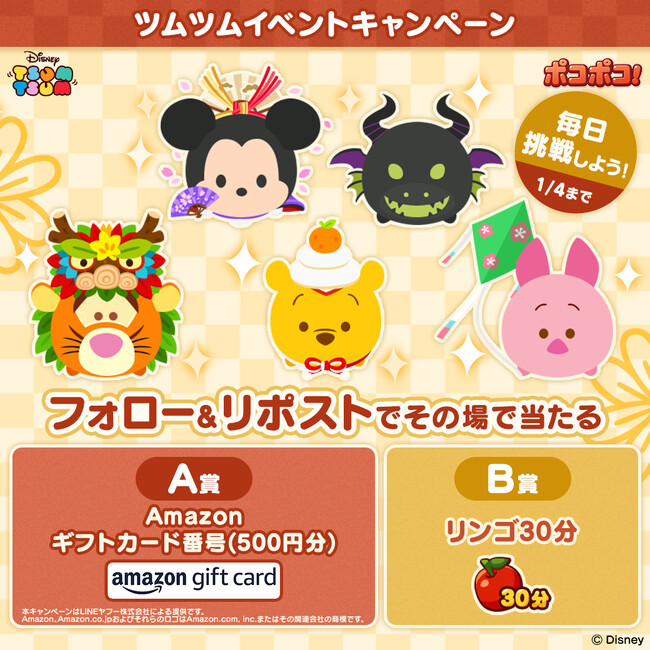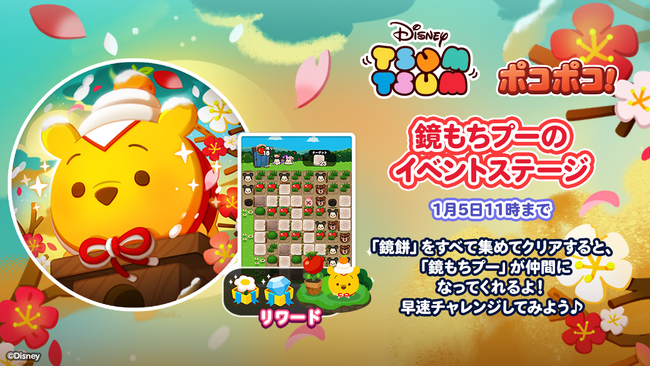 本イベントでは、「ディズニー ツムツム」から「鏡もちプー」、「晴れ着ミッキー」、「晴れ着ミニー」、「ドラゴンティガー」、「凧あげピグレット」、「マレフィセントドラゴン」、「獅子舞スティッチ」が限定仲間として登場。さらに、フォロー&リポストキャンペーンを始め、様々なイベント&キャンペーンを同時開催します。
