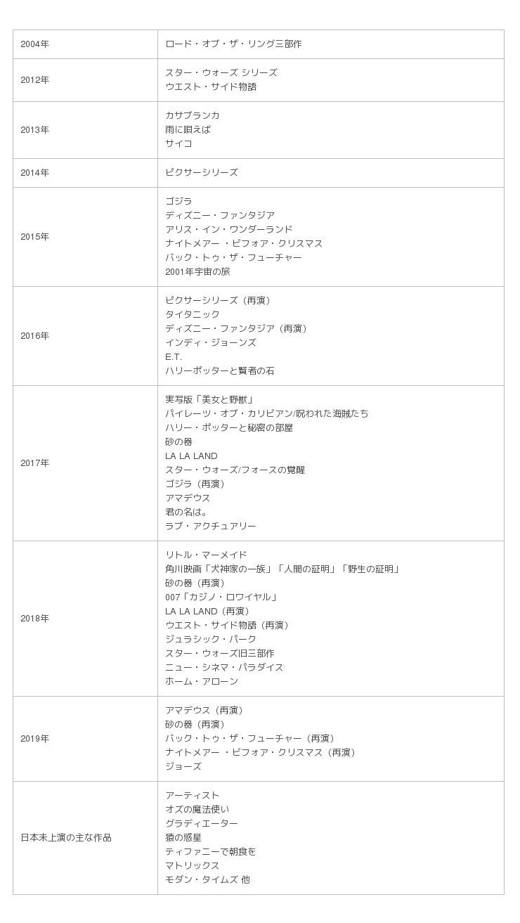 もともと欧米では80年代から取り組まれていましたが、日本で映画全編を生演奏つきで初めて上映したのが、2012年「ウエスト・サイド物語」。以降上演本数が増え、「E.T.」「インディ・ジョーンズ」「ホーム・アローン」「アリス・イン・ワンダーランド」「美女と野獣」「ジュラシック・パーク」「007カジノロワイヤル」等の名作が上演され、公演を重ねる度にファンを築いています。