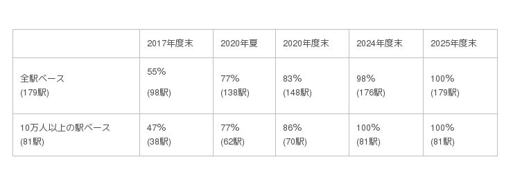 本計画では、2024年度までに1日10万人以上のお客様がご利用になる駅への整備を完了させ、2025年度までに全駅にホームドアを整備することを目指します。
